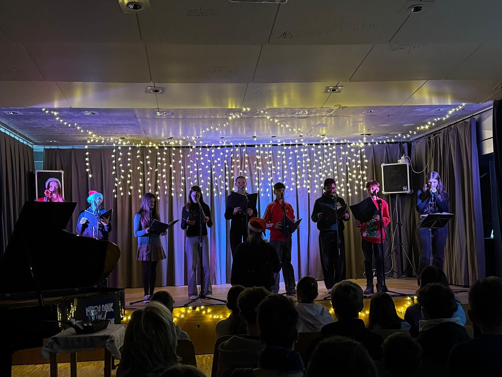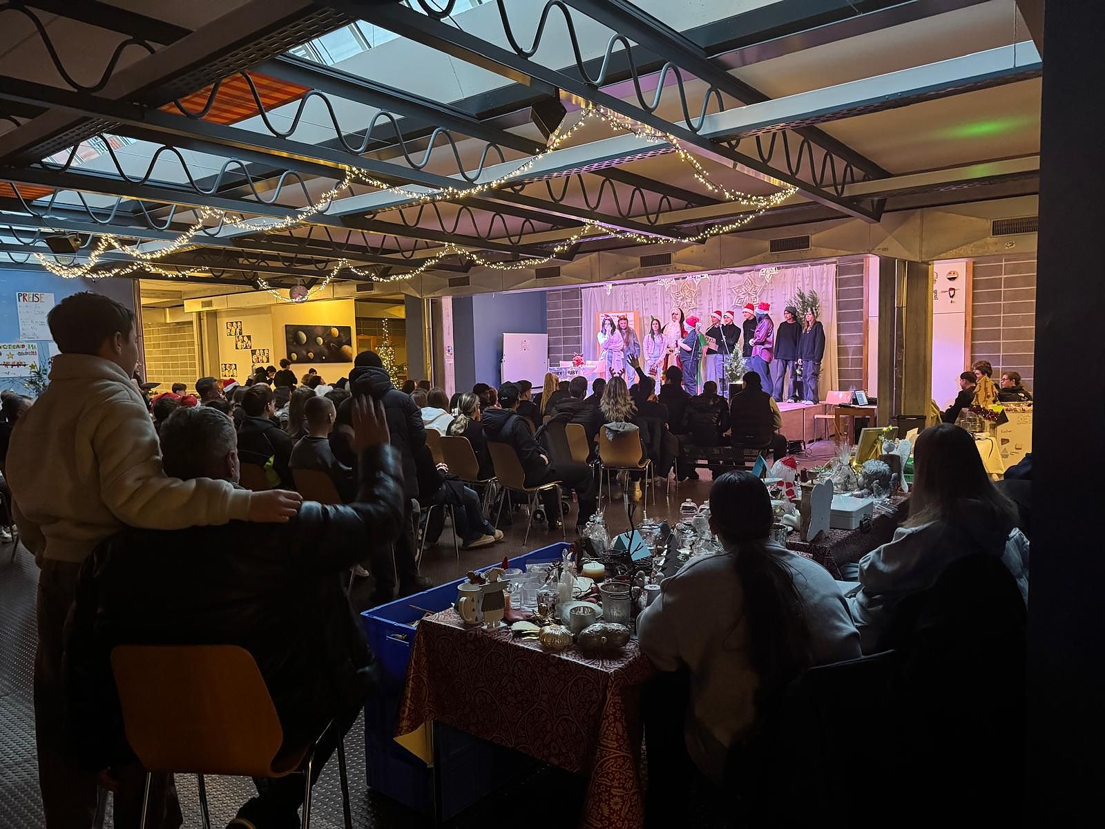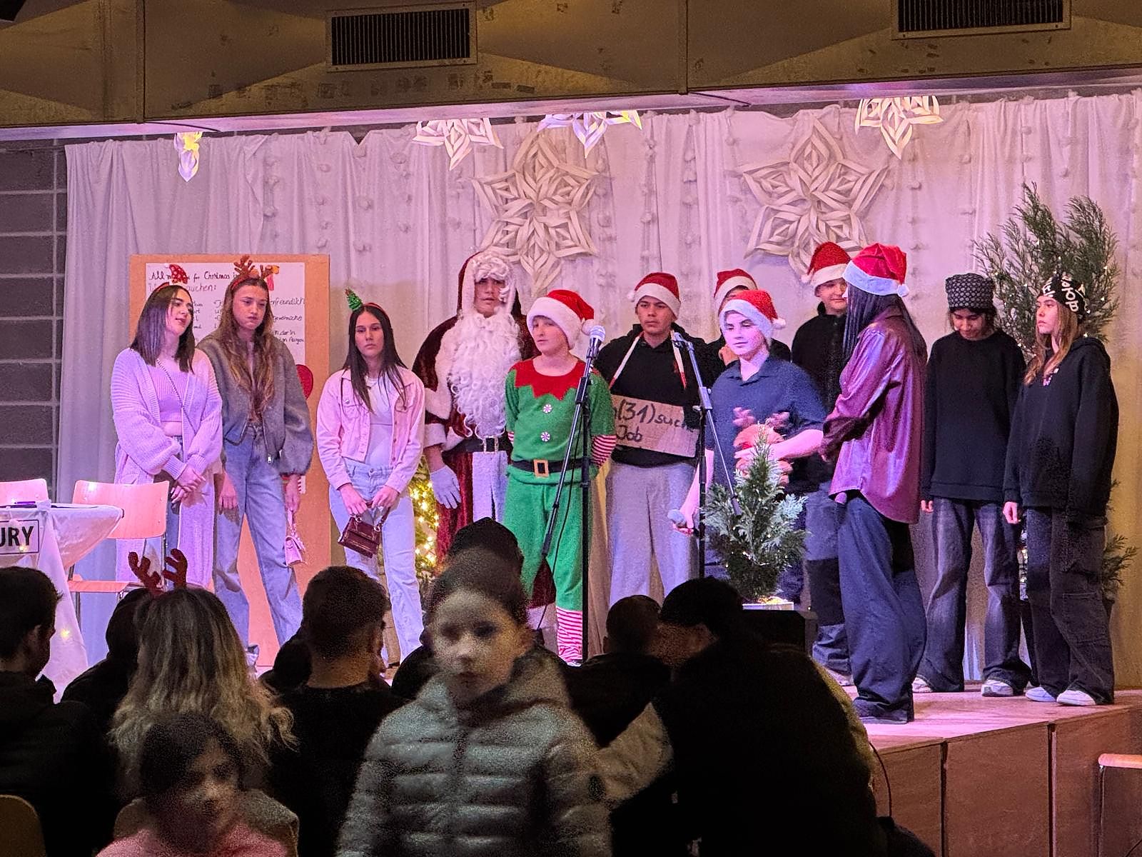 Neben dem kulinarischen Angebot wurden die Besucher durch den Schulchor unter der Leitung von Herrn Andri Hoegger und Luca Gosteli am Klavier unterhalten. Die Realschulkasse 2c hatte mit ihrer Klassenlehrperson Frau Selma Kiraz ein kleines Theaterstück einstudiert, in dem auf lustige Weise ein Weihnachtsmann gesucht wurde.