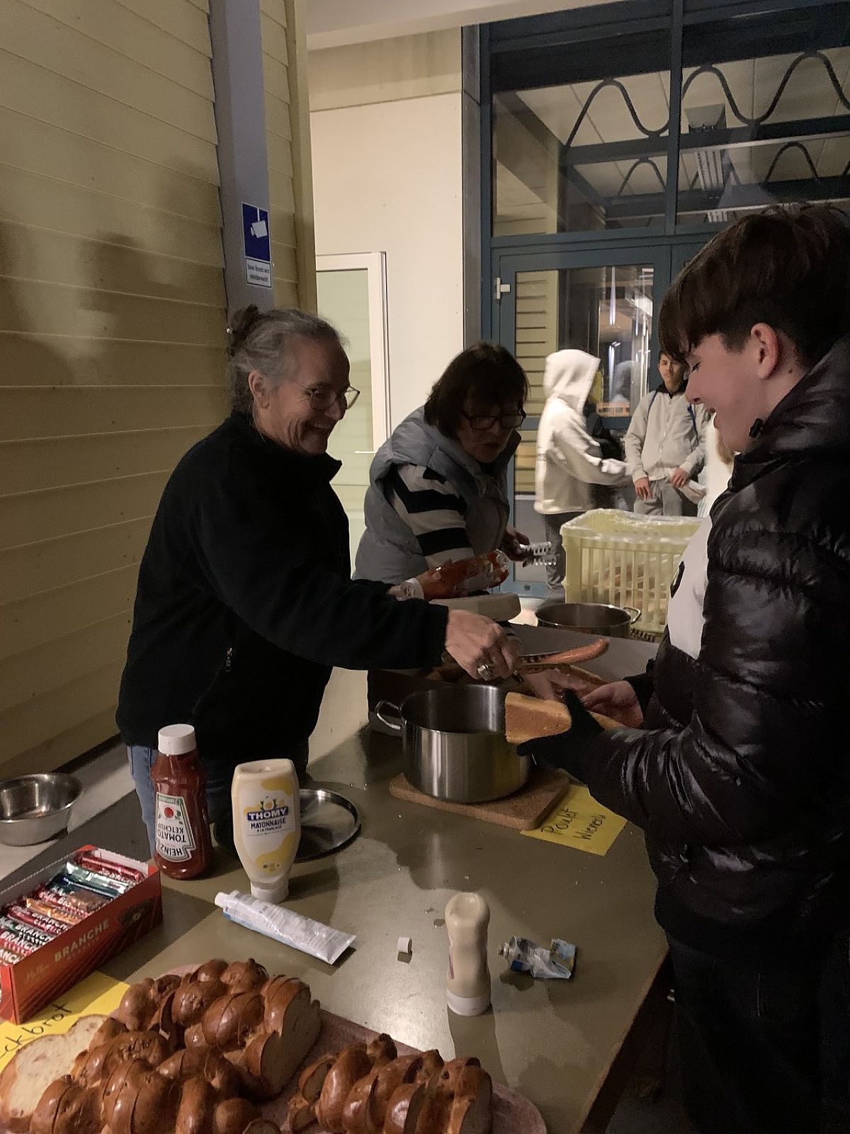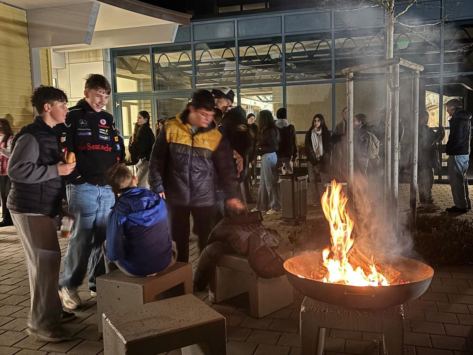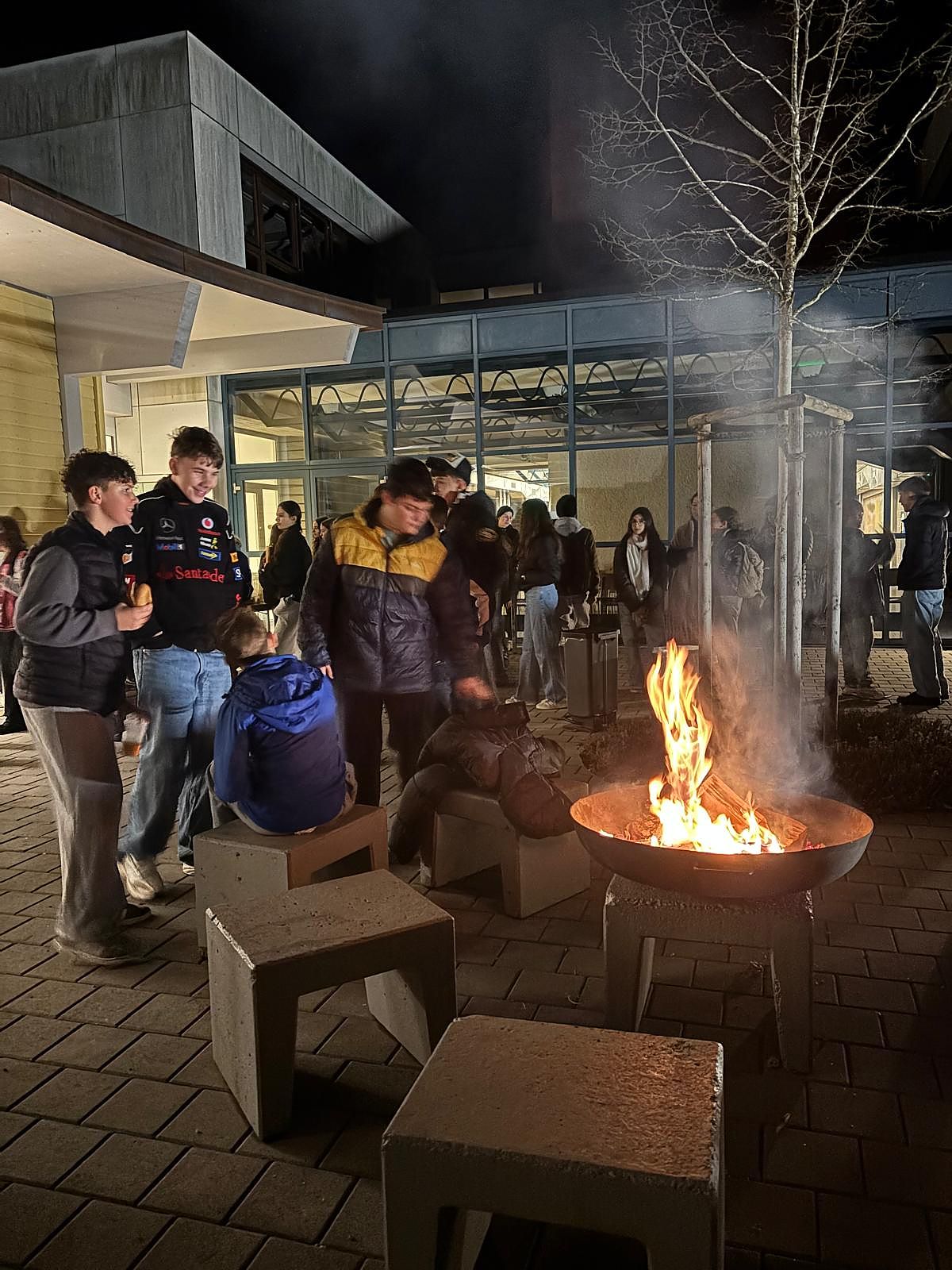 Nach langem Marsch wurden alle Schülerinnen und Schüler - nach Jahrgang gestaffelt - von den Kochschullehrerinnen vor der Kochschule im Freien erwartet und bekamen dort heissen Tee und einen Hotdog spendiert. Die Stimmung war ausgelassen und fröhlich und das wärmende Feuer sehr willkommen.