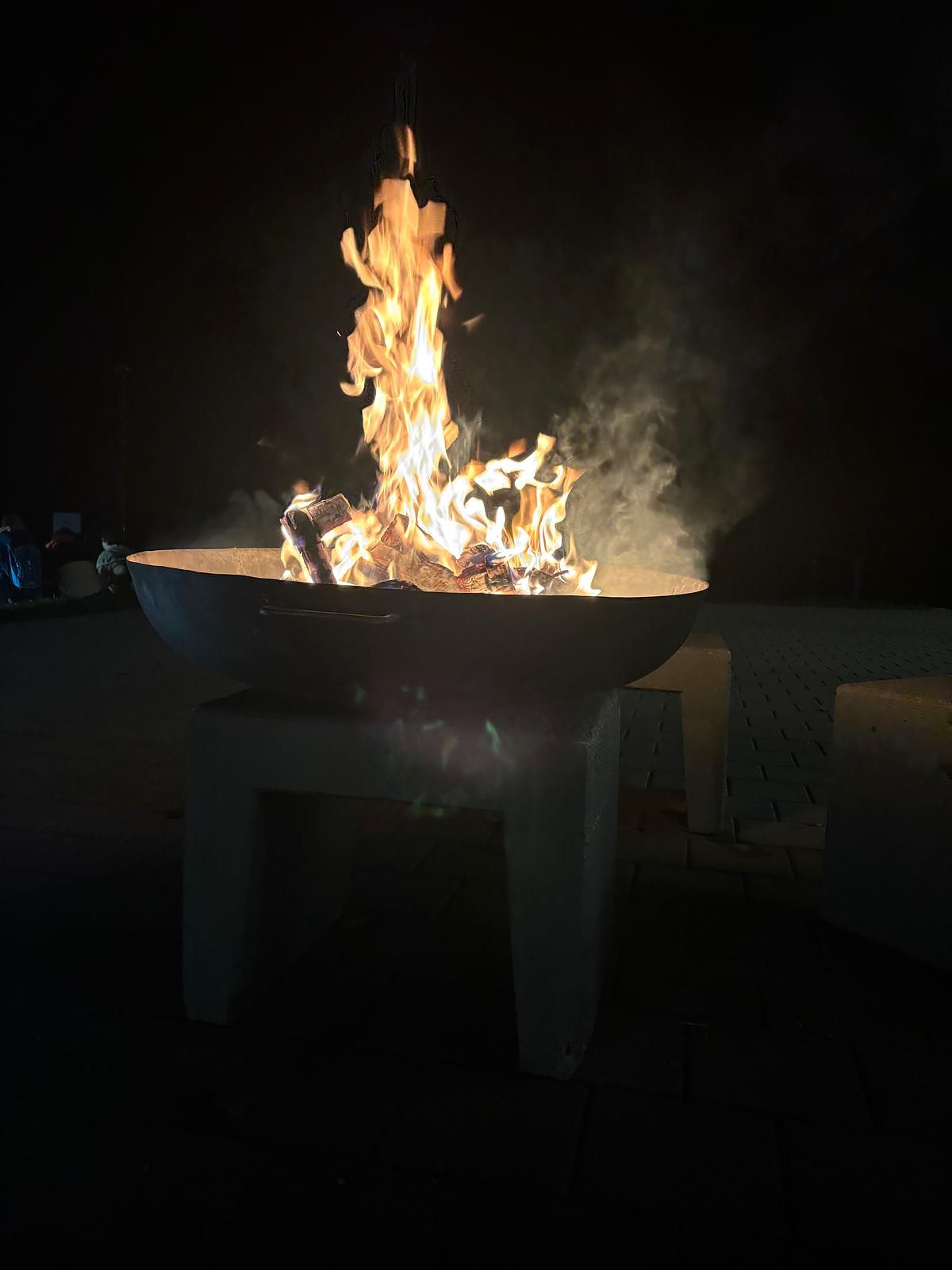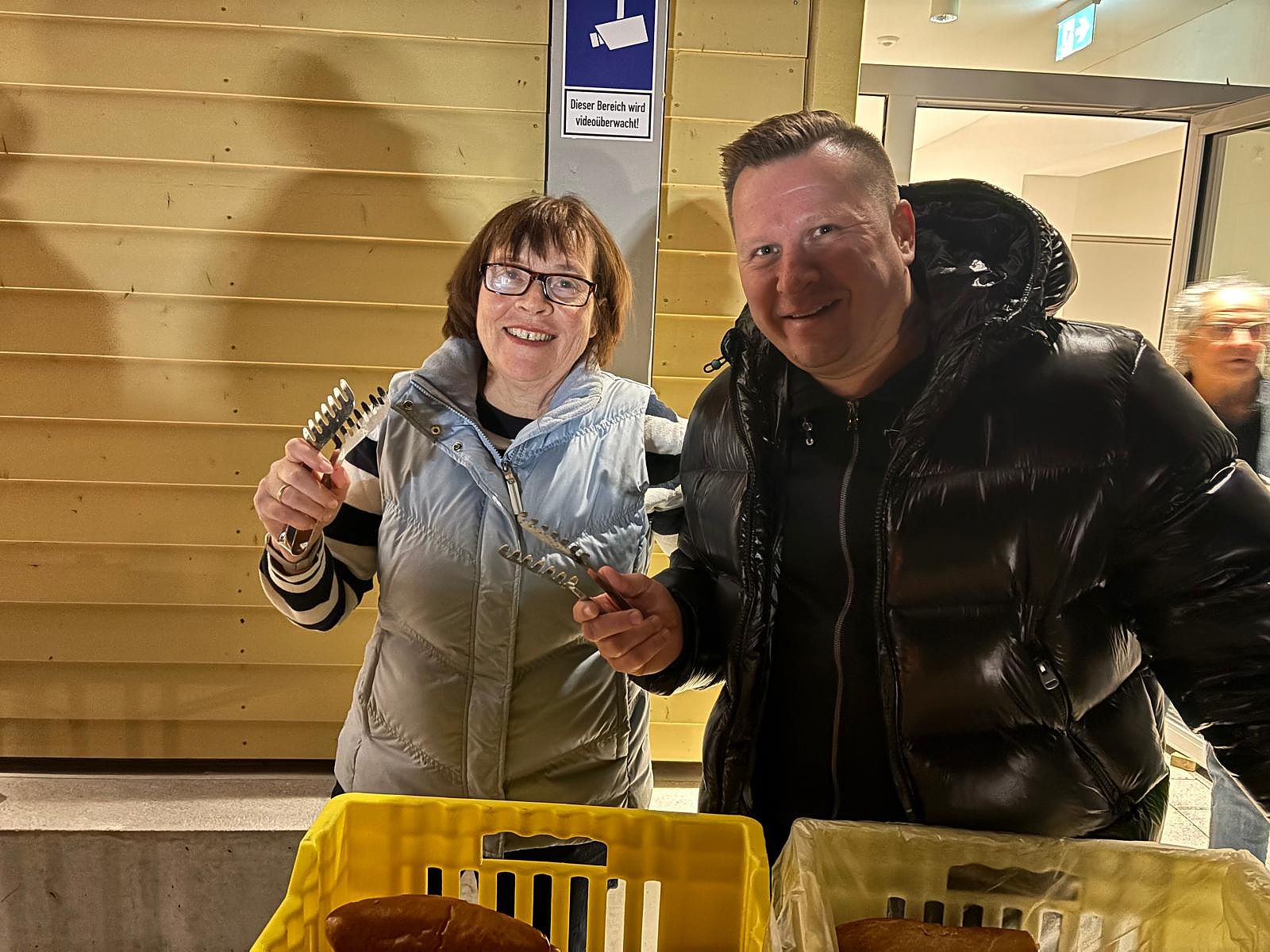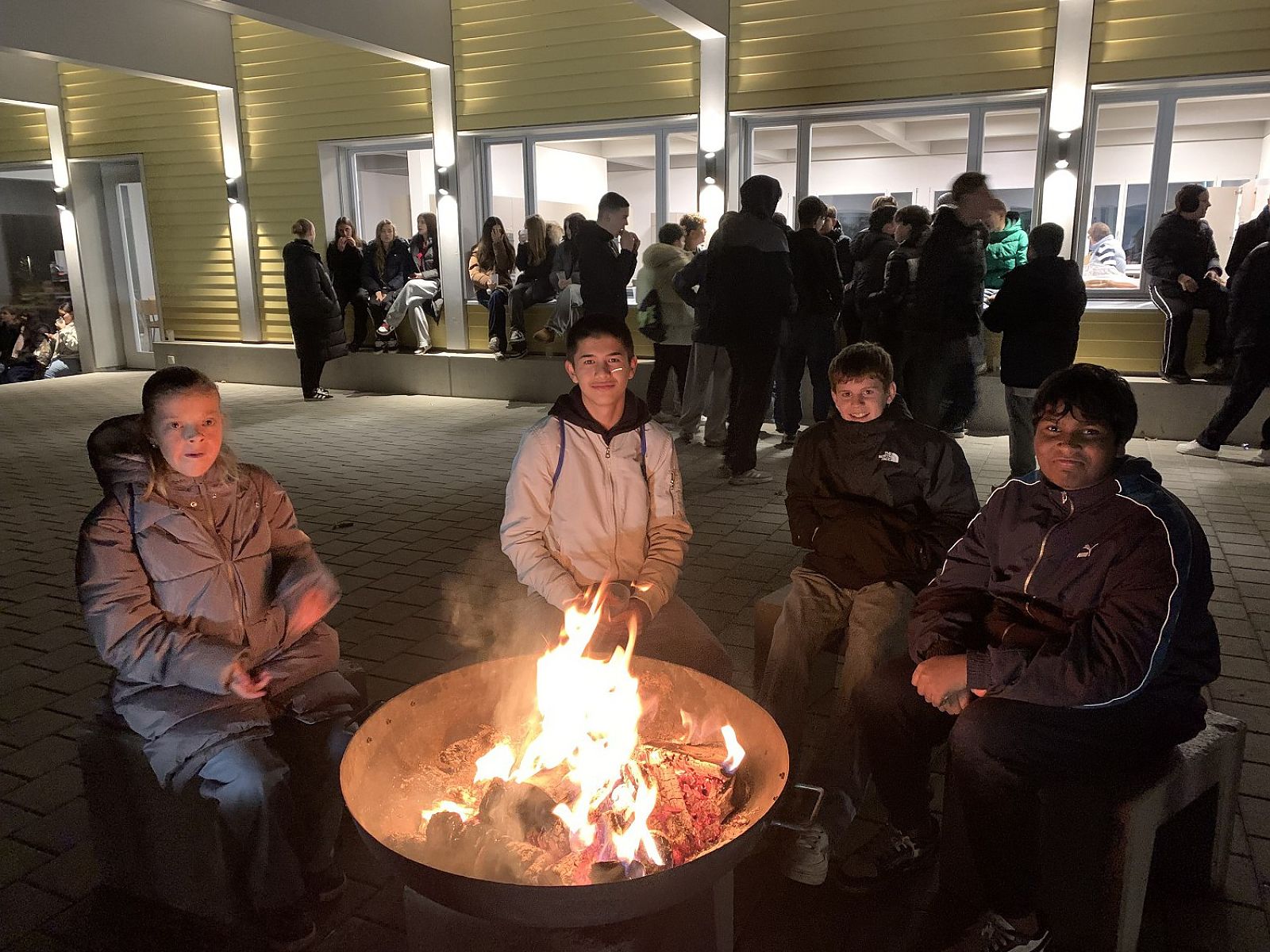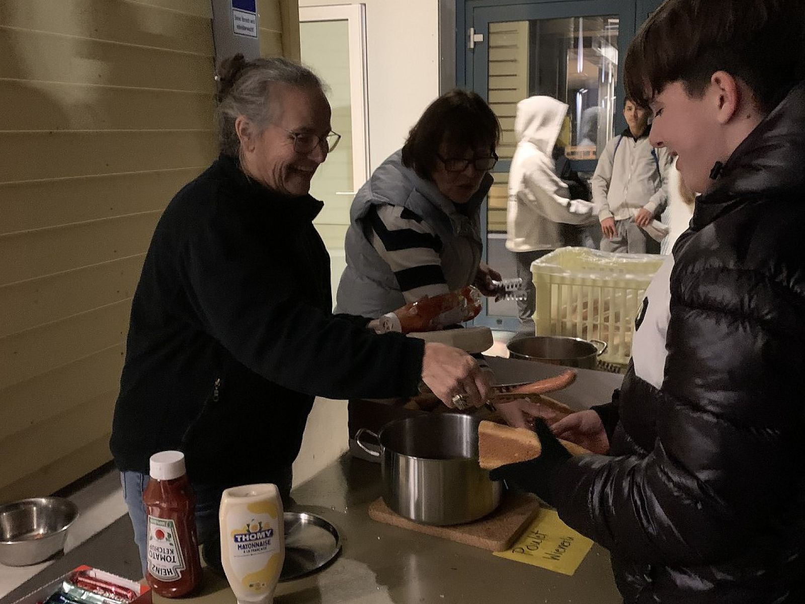 Nach langem Marsch wurden alle Schülerinnen und Schüler - nach Jahrgang gestaffelt - von den Kochschullehrerinnen vor der Kochschule im Freien erwartet und bekamen dort heissen Tee und einen Hotdog spendiert. Die Stimmung war ausgelassen und fröhlich und das wärmende Feuer sehr willkommen.